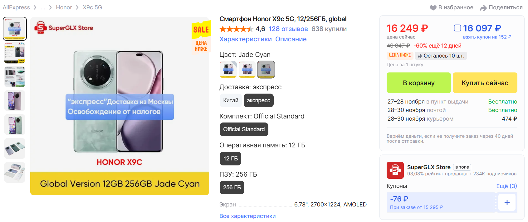 💫Honor X9c за 16 097 рублей с учетом купона продавца в Черную пятницу на Али