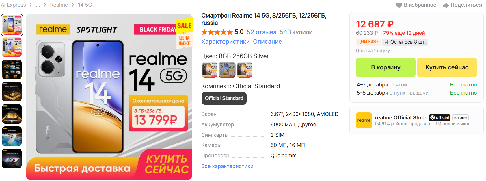 🏆Realme 14 5G за 12 687 рублей в Черную пятницу на Али
