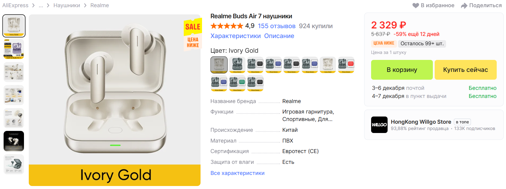 🎧Realme Buds Air 7 за 2 329 рублей в Черную пятницу на Али