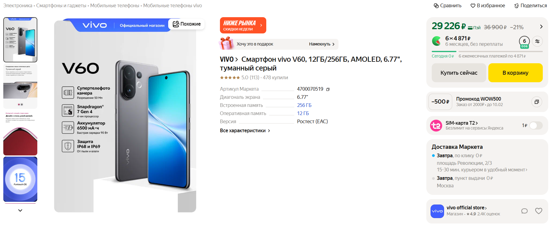 🔥Vivo V60 за 29 226 рублей при оплате картой «Пэй» на Маркете
