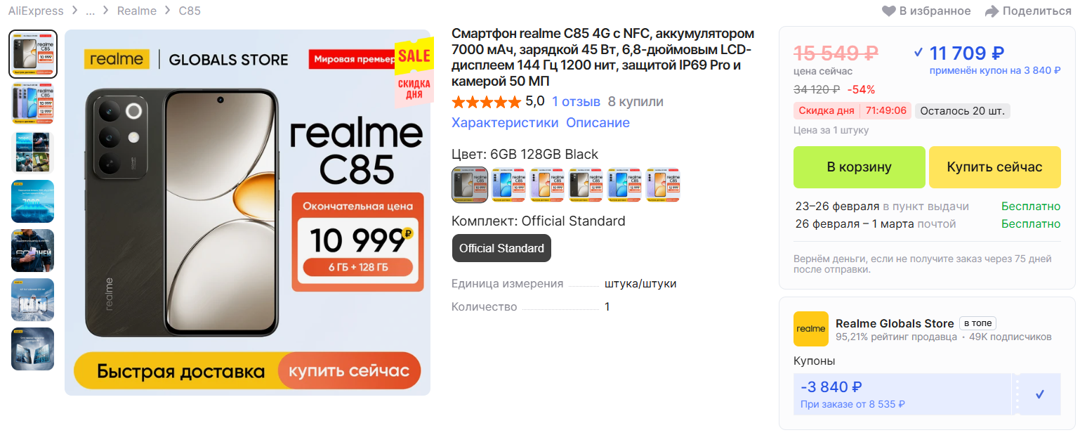 📱Realme C85 за 11 709 рублей с учетом купона продавца на Али