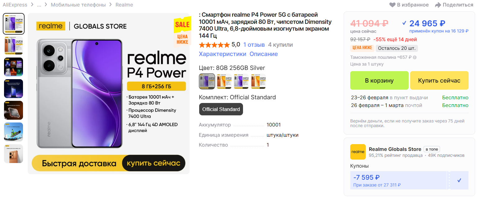 🔋Новинка! Realme P4 Power за 24 965 рублей с учетом купона продавца на Али