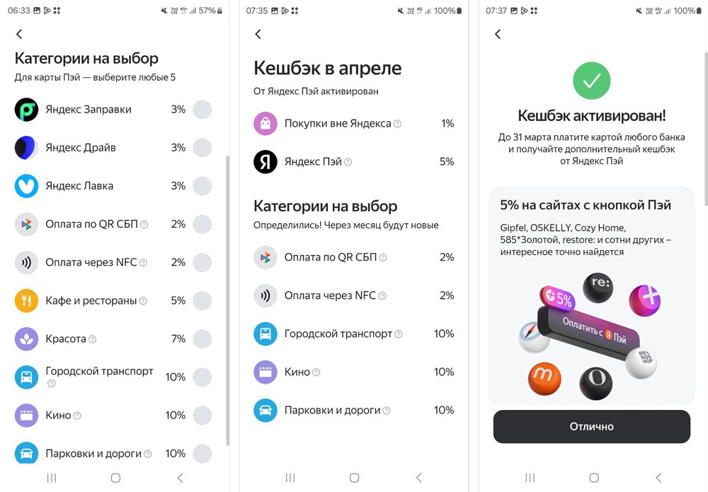 В апреле по "Карте Пэй" от "Яндекс Банка" снова доступен для выбора кэшбэк на все покупки при оплате через NFC (в приложении "Яндекс Пэй" на Android, не путать с Mir Pay) и по QR СБП, правда, обещают не 3%, а только 2%.