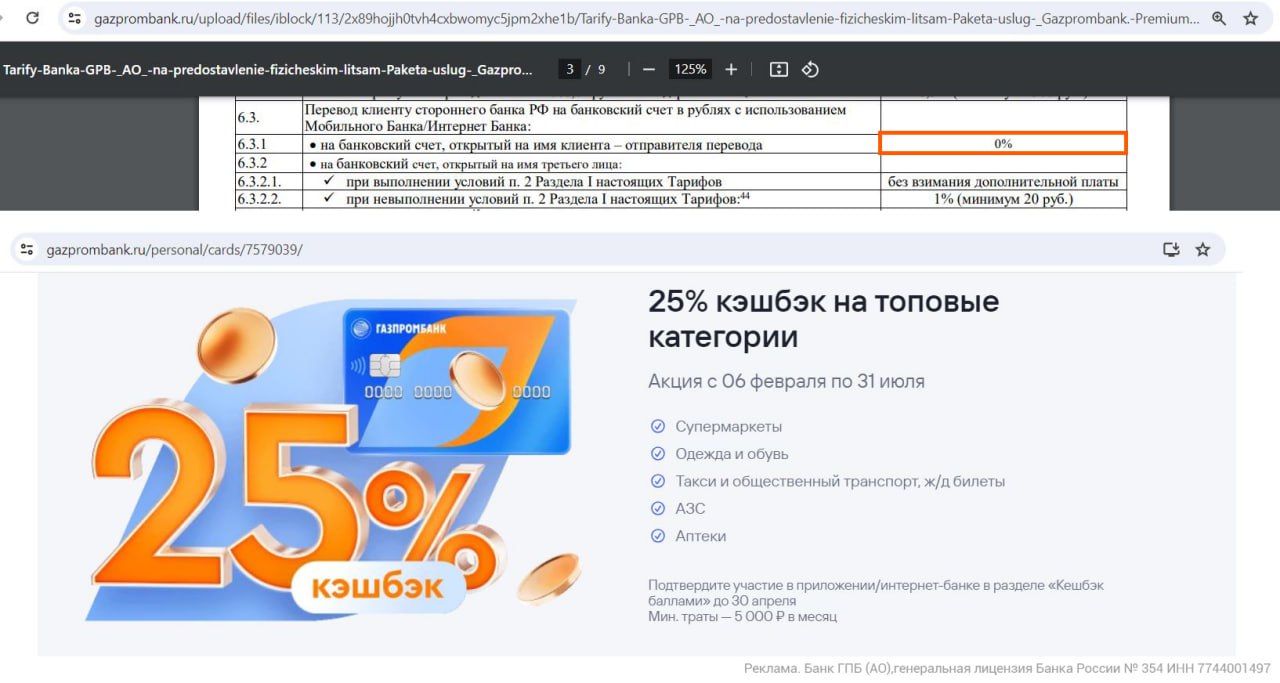 • На премиальных картах "Газпромбанка" без выполнения критериев "Премиума" опять появился бесплатный межбанк через интернет-банк и мобильное приложение (переводы по номеру счёта и БИК банка), правда, только на свои счета в других банках. Лимит на один перевод — 300 000 руб., месячный — 5 000 000 руб. Дневного нет.