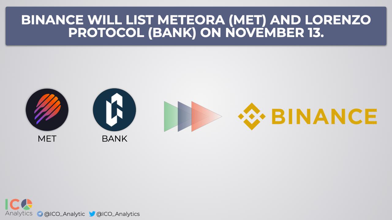 Binance will list Meteora (MET) and Lorenzo Protocol (BANK) on November 13. Trading will go live at 14:00 (UTC).