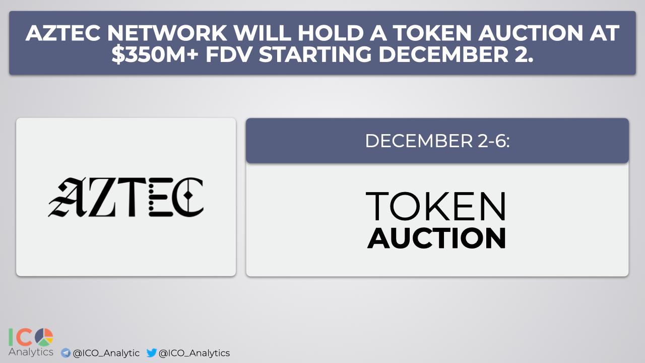 Privacy-focused Layer 2 Aztec Network will hold a token auction from December 2 to December 6. Registration is now live. Bidding will start at a $350M FDV. 15% of the token supply will be offered for sale. A minimum 90-day and maximum 1-year lockup period will apply to sale participants.