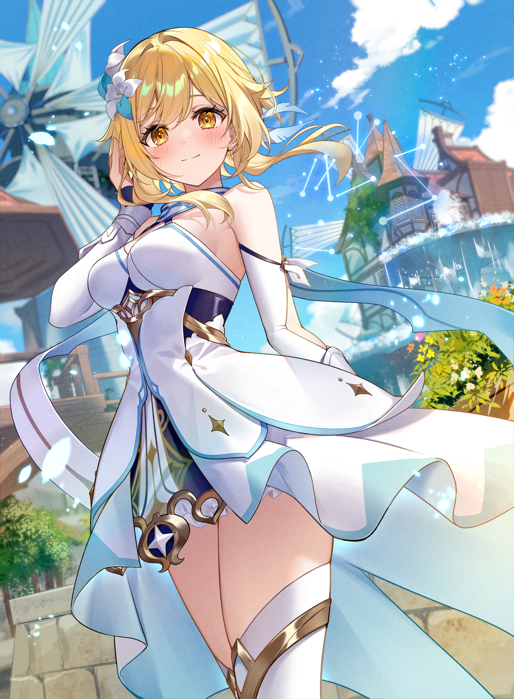 #dress #genshin_impact #kisaragi_yuri #lumine #no_bra #thighhighs