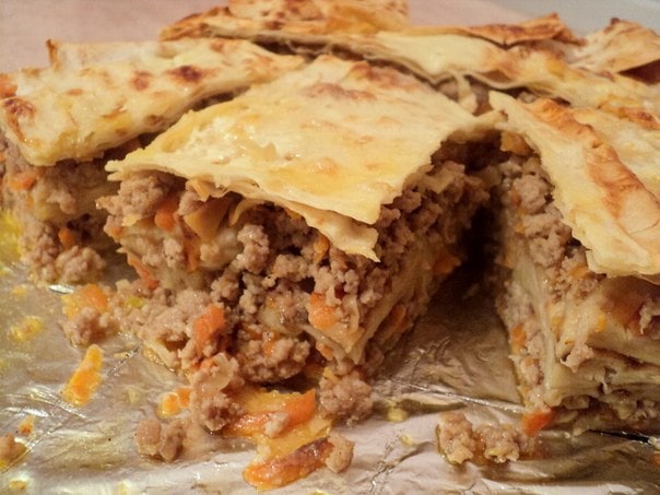 Чашу слегка смазать маслом. Выстелить лавашом и половину фарша выложить на лаваш. Сверху на фарш выложить кусочки лаваша смоченные в кефире с яйцом.