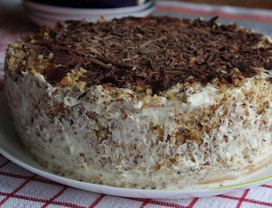 Торт разрезать на 3 коржа. Коржи немного остудить, намазать кремом и собрать торт. Сверху можно посыпать тёртым шоколадом, орехами, полить сиропом или джемом, украсить кусочками фруктов.