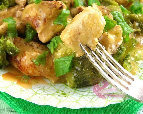 2. В отдельной посуде перемешиваем 1 яйцо и сливки. Заливаем и перемешиваем курицу со специями и заливкой. Отставляем в сторону.
