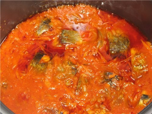Лук выложить на дно чаши мультиварки, затем слоями морковь, рыбу, немного приправы, сахар, остальные овощи. Кетчуп развести водой (0,5 мультистакана). Полить овощи и рыбу, закрыть крышку. Готовить в режиме "ДЕТСКОЕ МЕНЮ" - 20 мин.. Если нет этого режима, можно использовать режим ТУШЕНИЕ, время - минут 30.