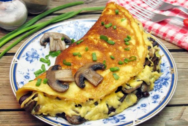 Отдельно в миске взбейте молоко с яйцами и натертым сыром, не забудьте оставить часть сыра для того, чтобы посыпать омлет сверху. Посолите смесь и поперчите, добавьте зелень и тщательно все перемешайте. А сейчас добавьте полученную смесь в мультиварку, налейте ее поверх грибов и лука. Сверху посыпьте все сыром и включите режим "Выпечка" на 30 минут. Как только мультиварка завершит приготовление, дайте омлету настояться и вытащите его на блюдо. Переверните омлет и порежьте на несколько порций.