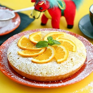 Апельсиновый кекс готов. Остывший кекс вынуть из чаши, сделать на поверхности проколы вилкой и облить оставшимся соком. Украсить апельсиновыми дольками. Посыпать сахарной пудрой.
