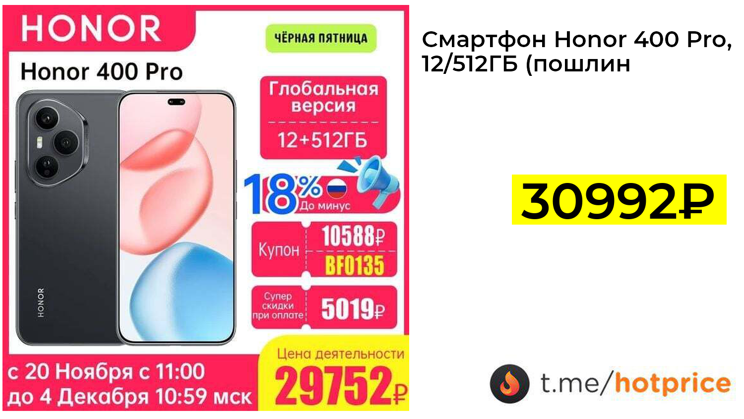 🔹 Смартфон Honor 400 Pro, 12/512ГБ (пошлина 3171₽) за 30992₽ ❗️