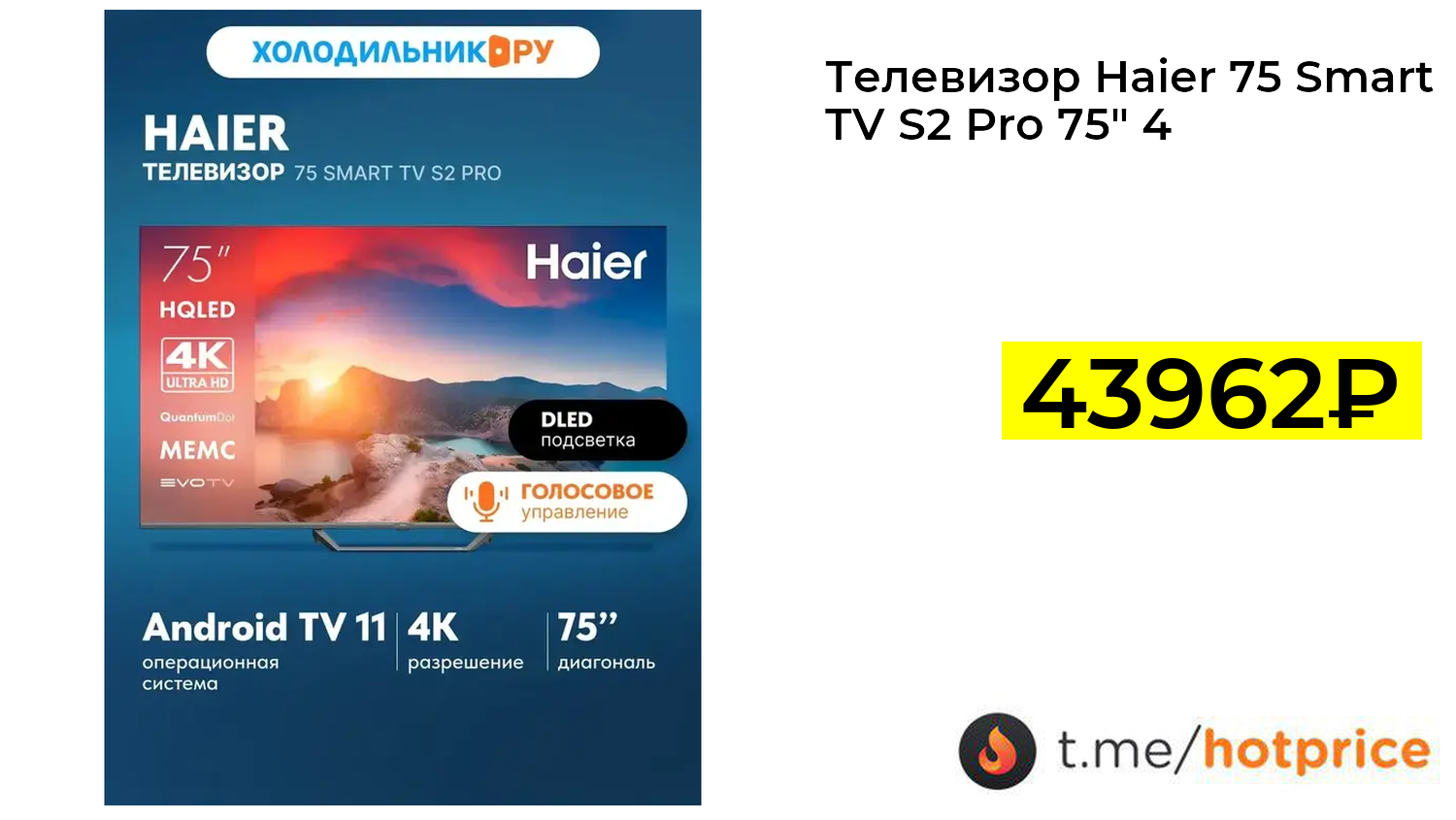 🔹 Телевизор Haier 75 Smart TV S2 Pro 75" 4К Android TV (с ВБ кошельком) за 43962₽ ❗️