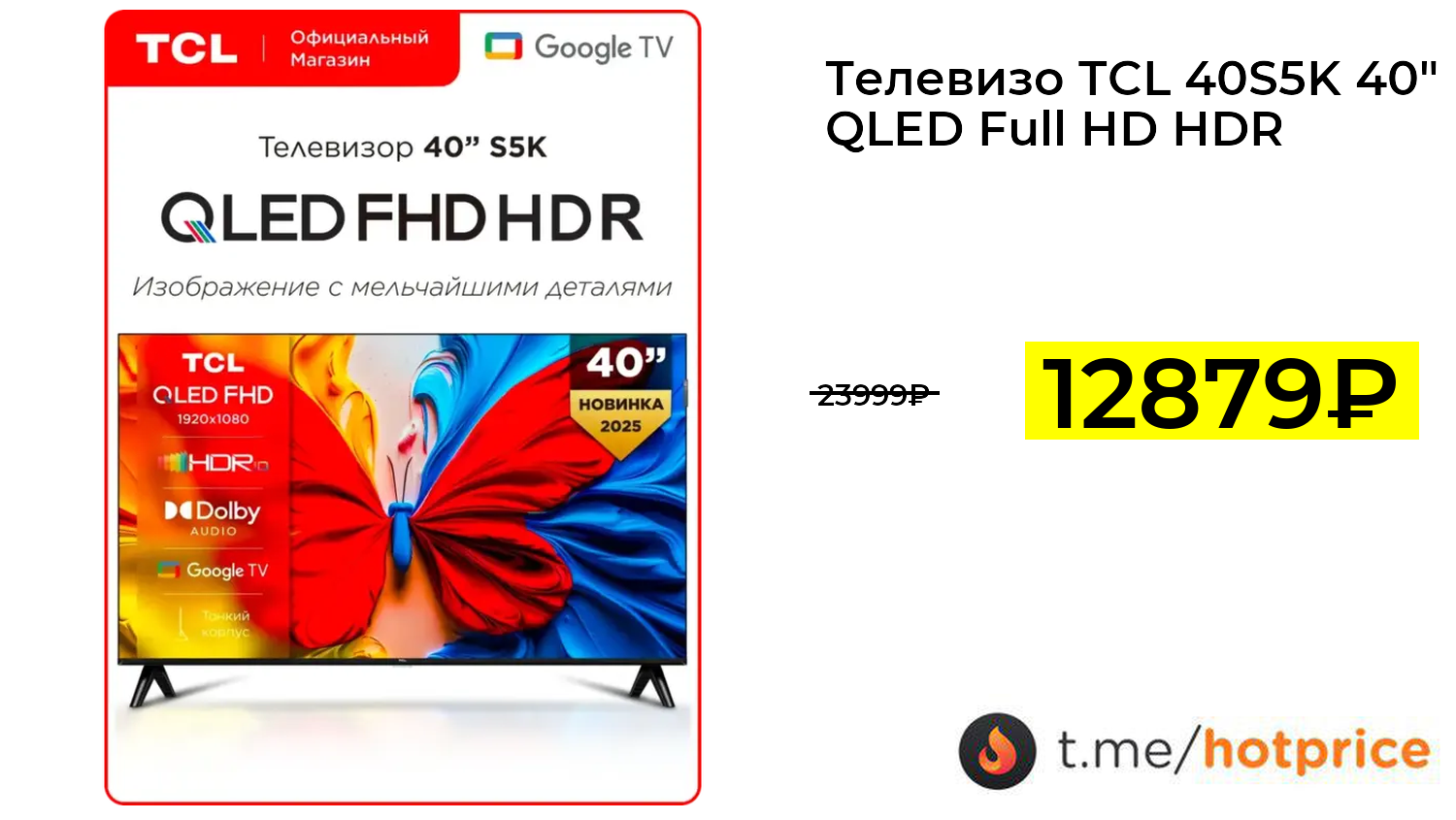 🔹 Телевизо TCL 40S5K 40" QLED Full HD HDR GoogleTV (с ВБ кошельком) за 12879₽ ❗️ (везде: 23999+₽)