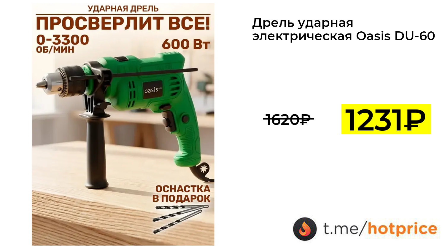 🔹 Дрель ударная электрическая Oasis DU-60 Eco 600 Вт + оснастка (с ВБ кошельком, 200 баллов за отзыв) за 1231₽ ❗️ (везде: 1620+₽)