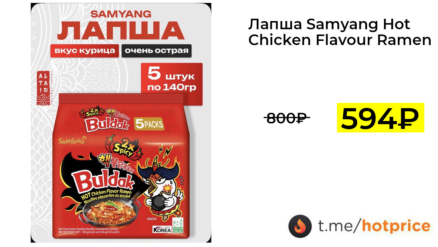 🔹 Лапша Samyang Hot Chicken Flavour Ramen 2x Spicy 5шт (по карте Ozon) за 594₽ ❗️ (везде: 800+₽)