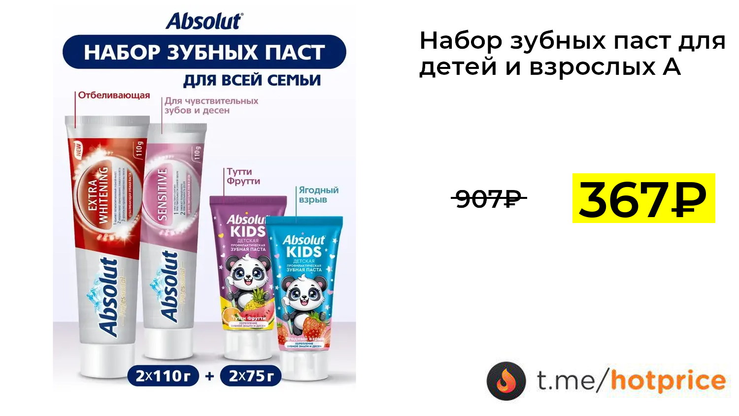 🔹 Набор зубных паст для детей и взрослых Absolut, 2х110 г и 2х75 г (с ВБ кошельком) за 367₽ ❗️ (везде: 907+₽)