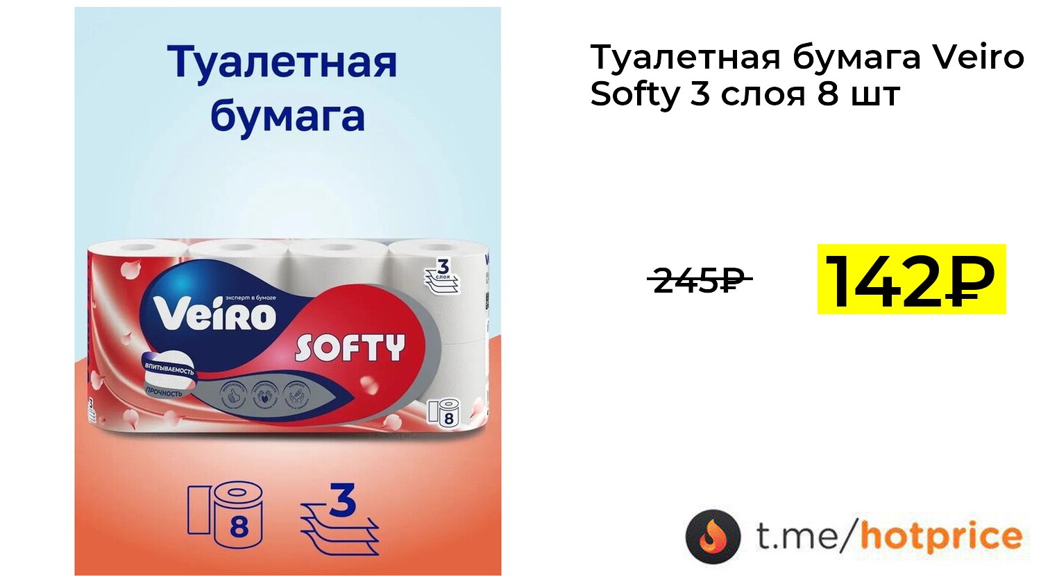 🔹 Туалетная бумага Veiro Softy 3 слоя 8 штук Белая (с картой ozon) за 142₽ ❗️ (везде: 245+₽)