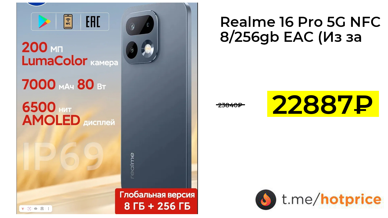 🔹 Realme 16 Pro 5G NFC 8/256gb EAC (Из за рубежа, с Озон картой + пошлина 1557р) за 22887₽ ❗️ (везде: 23840+₽)
