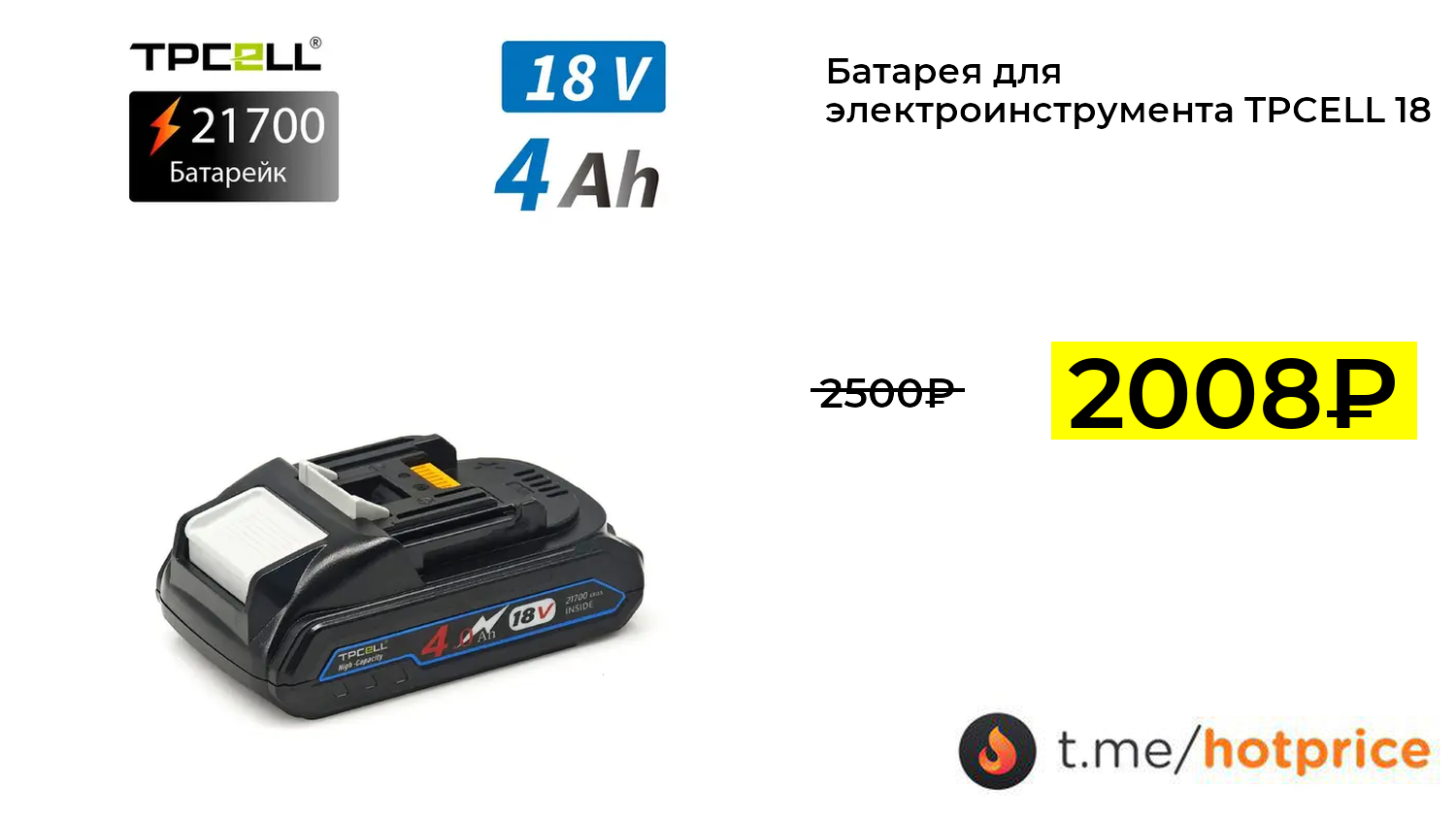 🔹 Батарея для электроинструмента TPCELL 18V 21700 5 клеток 4Ah (с картой OZON, из-за рубежа) за 2008₽ ❗️ (везде: 2500+₽)