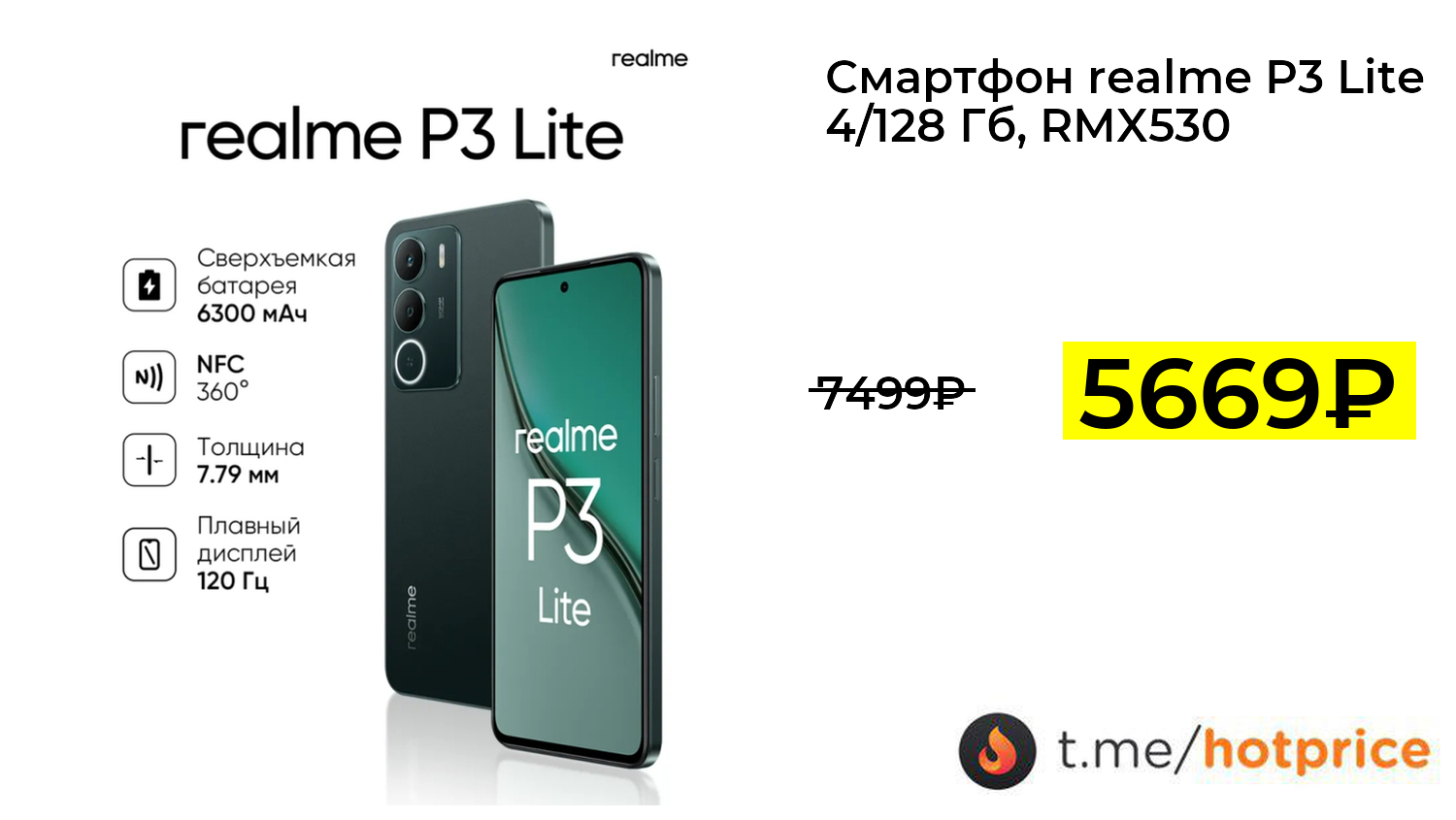 🔹 Смартфон realme P3 Lite 4/128 Гб, RMX5300 (с ВБ кошельком) за 5669₽ ❗️ (везде: 7499+₽)