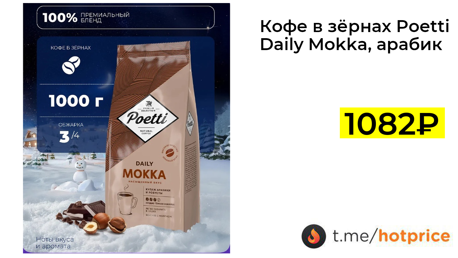 🔹 Кофе в зёрнах Poetti Daily Mokka, арабика, робуста, 1 кг (с картой OZON) за 1082₽ ❗️