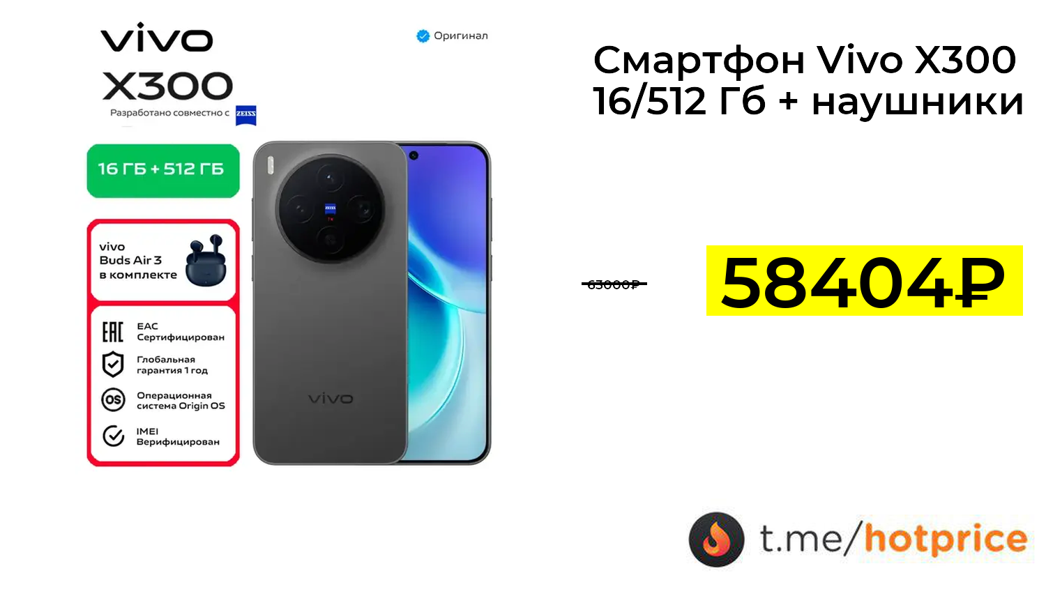 🔹 Смартфон Vivo X300 16/512 Гб + наушники Vivo Buds Air 3 (с макс. ВБ кошельком + клуб) за 58404₽ ❗️ (везде: 63000+₽)