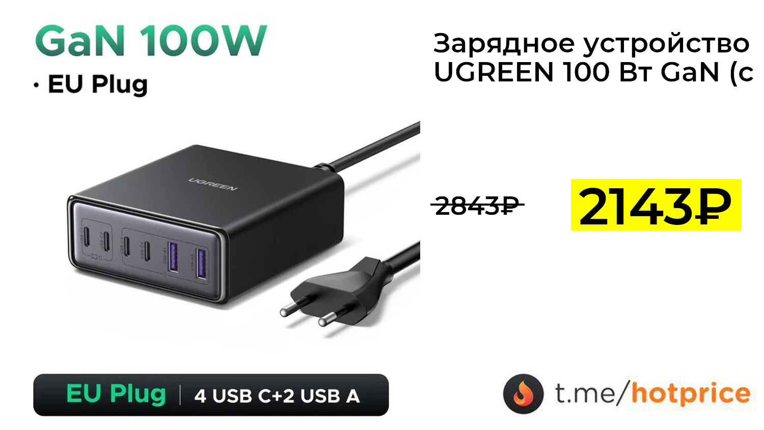 🔹 Зарядное устройство UGREEN 100 Вт GaN (с купоном продавца) за 2143₽ ❗️ (везде: 2843+₽)