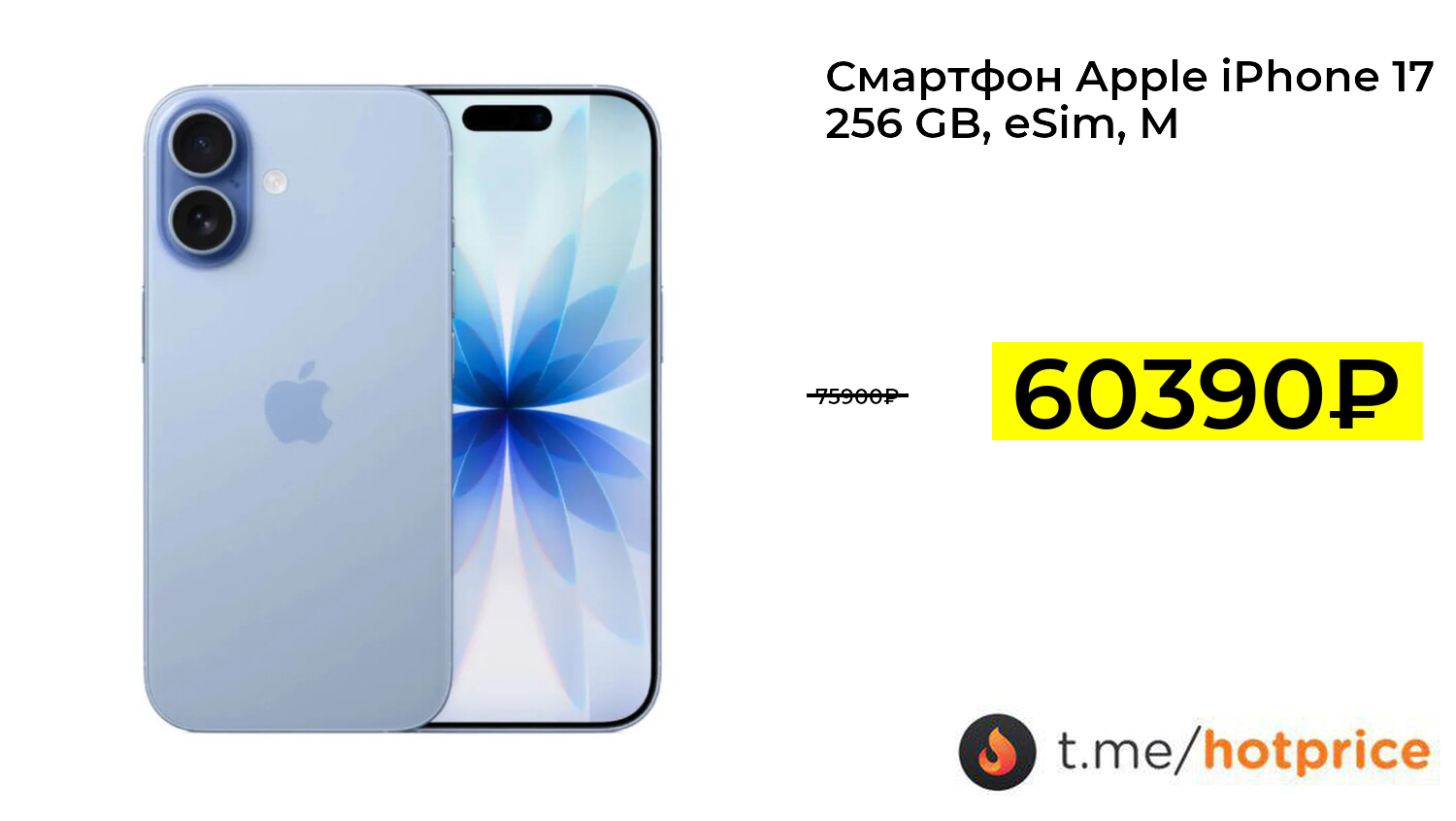 🔹 Смартфон Apple iPhone 17 256 GB, eSim, Mist Blue (с макс. кошельком ВБ) за 60390₽ ❗️ (везде: 75900+₽)