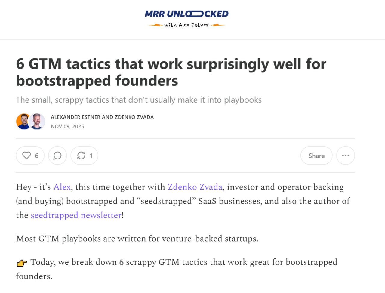 👉 Читайте подробнее по ссылке: https://www.mrrunlocked.com/p/6-bootstrapped-gtm-tactics